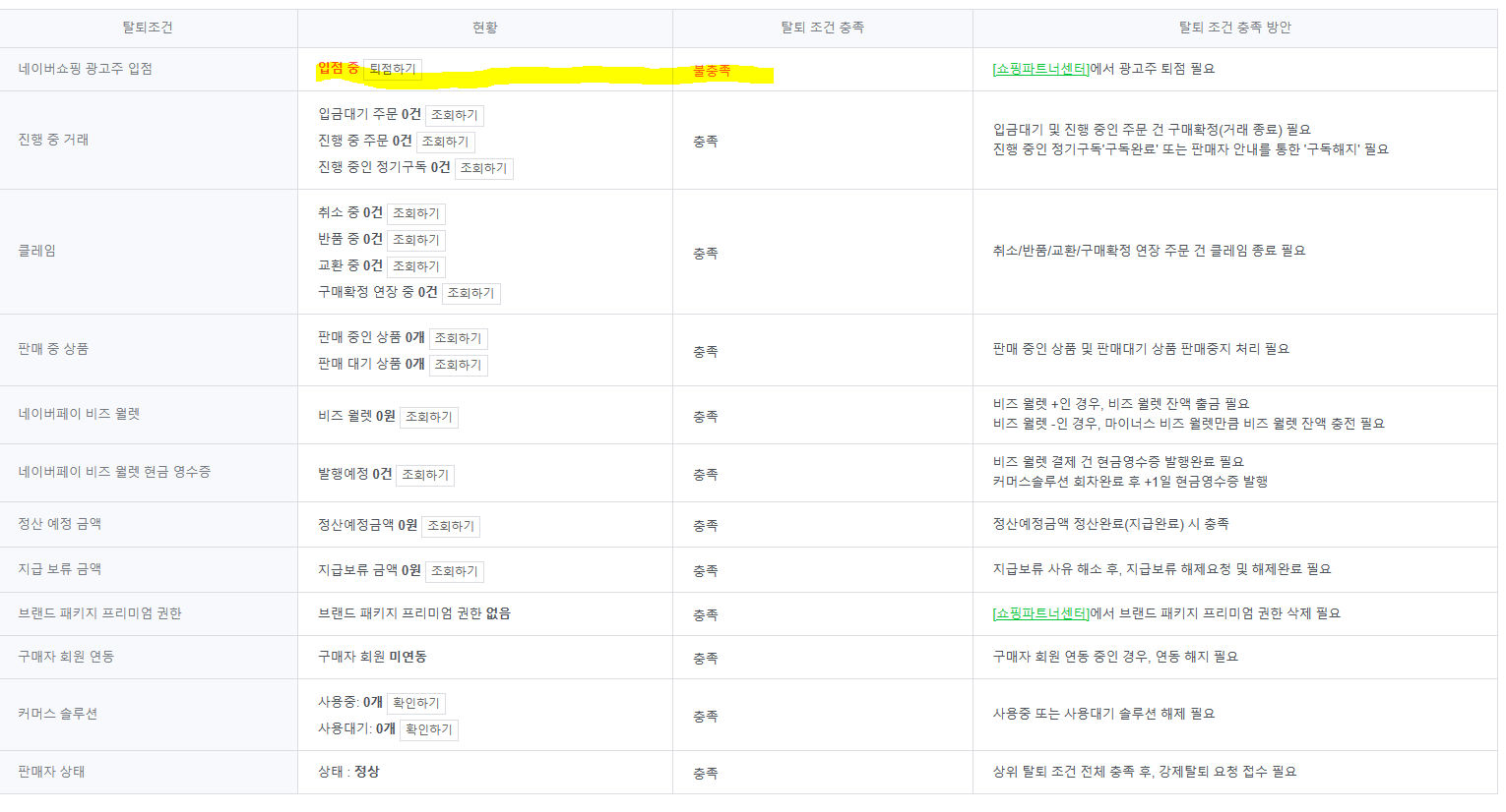 보통 운영을 안하고 있다면 네이버쇼핑 광고주 입점 부분만 불충족으로 뜨는 경우가 많습니다.