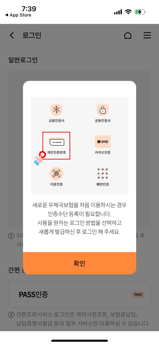 2. 우체국보험 어플 or 앱을 다운받은 뒤, 본인에게 맞는 인증방법을 통하여 로그인합니다.